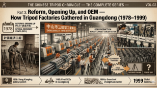 With Reform and Opening Up and Special Economic Zones, an OEM/ODM tripod manufacturing cluster formed in Zhongshan, Guangdong. It explains skill accumulation through contract manufacturing for overseas brands such as Manfrotto and SLIK.