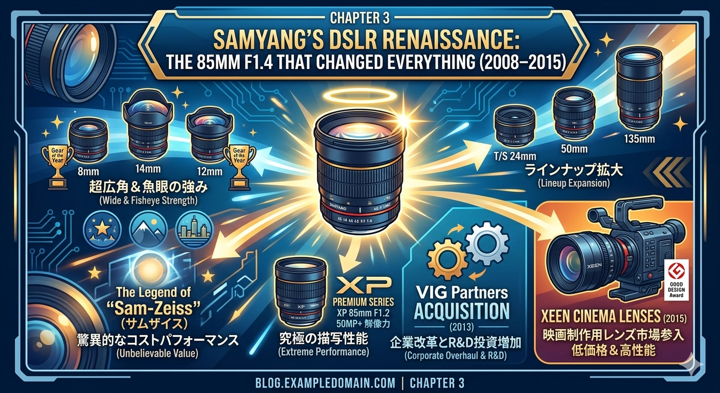 - Exit from OEM production: Ceased manufacturing budget lenses for other brands, concentrating resources on the Samyang brand