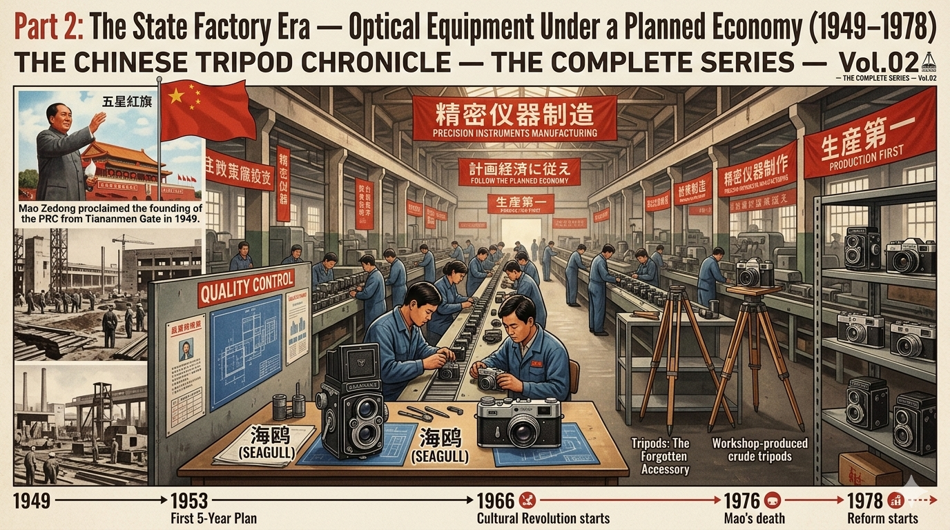 This second installment covers the three decades from 1949 to 1978, a period during which China built its first optical equipment factories, produced its first domestically made cameras, and yet left tripod manufacturing as an afterthought — a low-priority accessory in a system focused on heavier industrial goals.