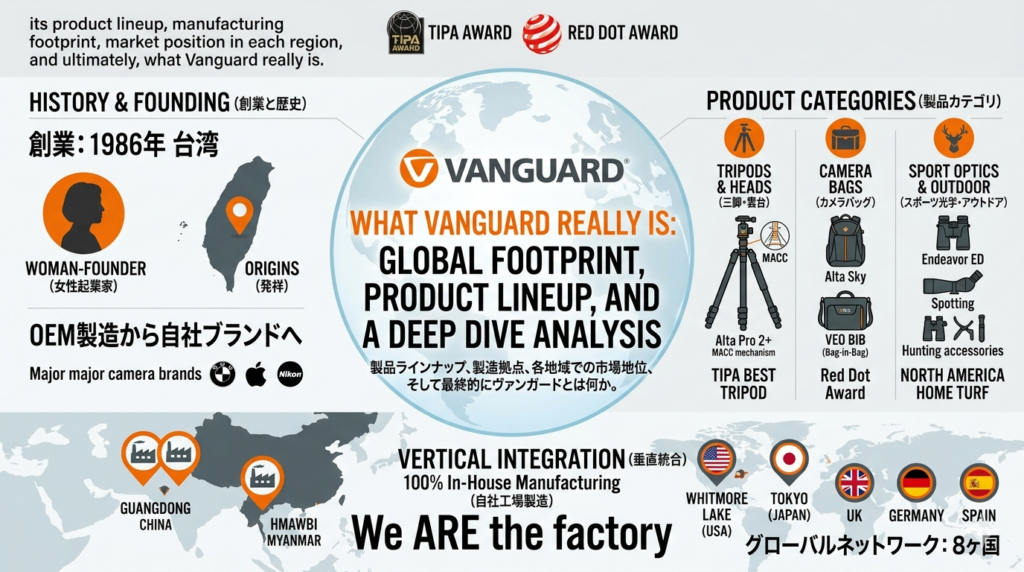 There are countless tripod manufacturers in the world. But surprisingly few can clearly answer all of these questions: Who founded it? Where are the products actually made? And why does it offer this level of quality at this price? Vanguard is one of those rare exceptions. Born in Taiwan in 1986, the brand started as an OEM manufacturer before pivoting to its own brand, building a global presence across three pillars: tripods, camera bags, and sport optics. In this series, we trace Vanguard’s journey from its founding to the present — its product lineup, manufacturing footprint, market position in each region, and ultimately, what Vanguard really is.